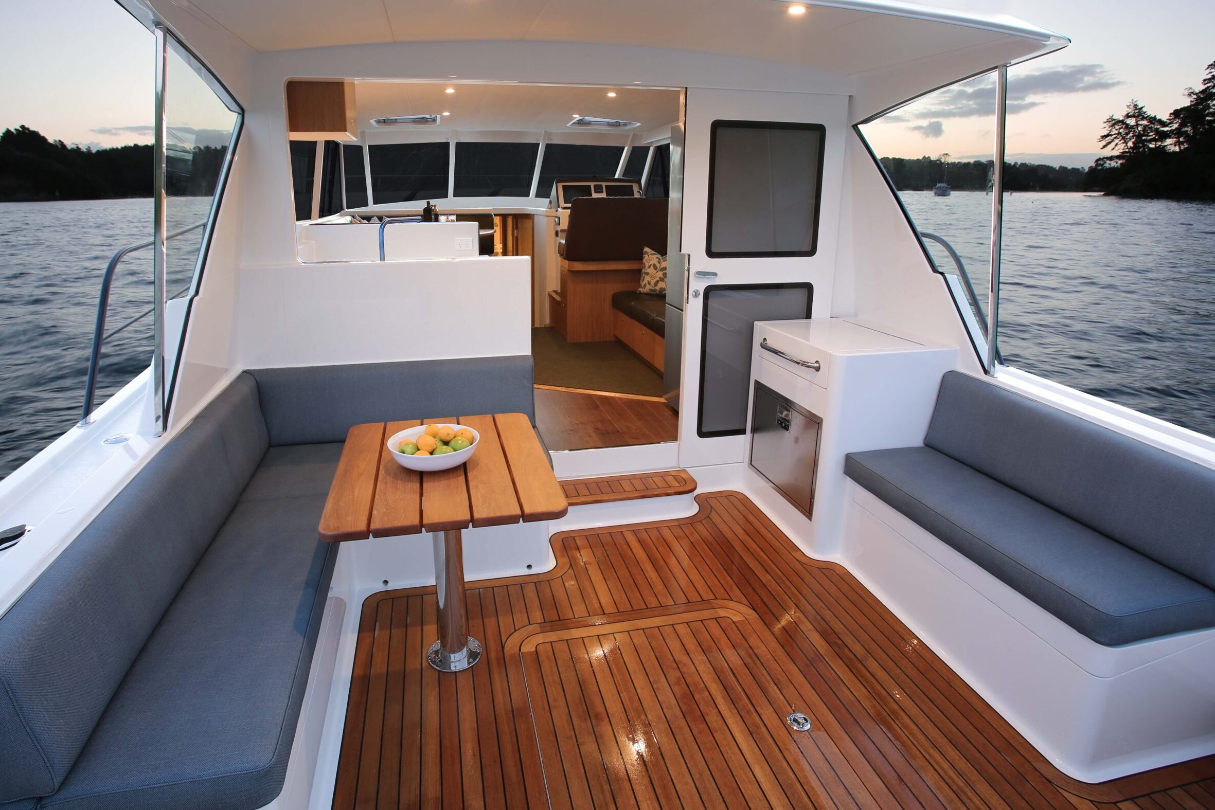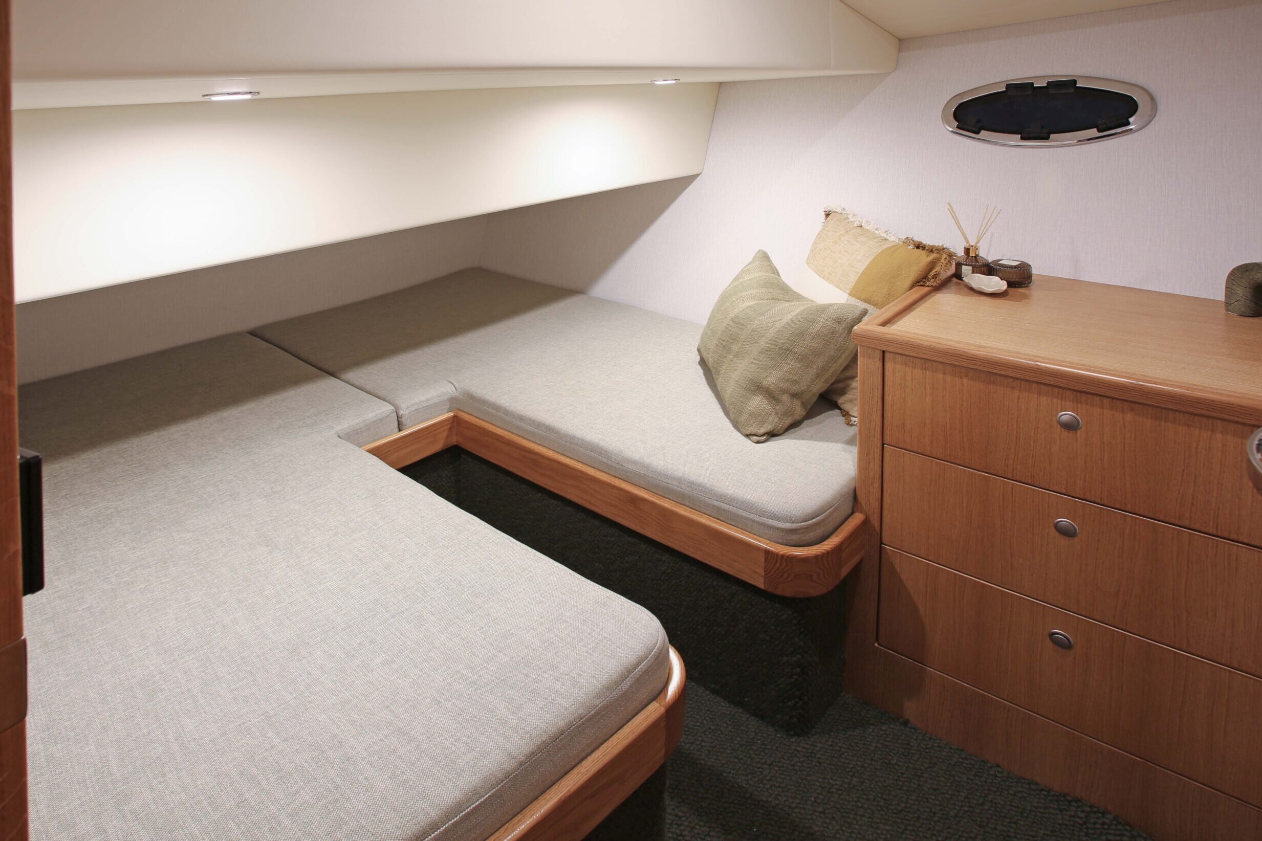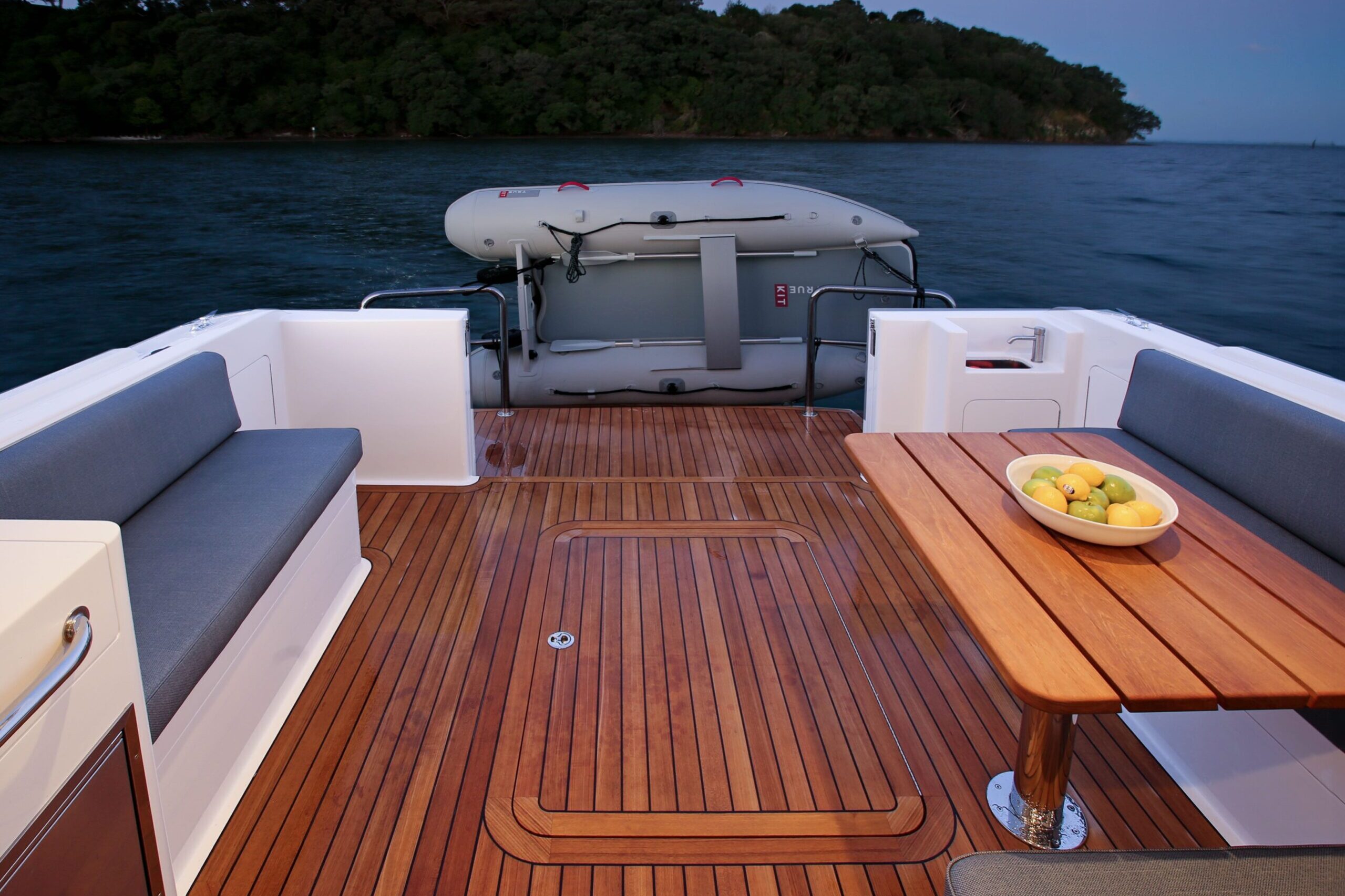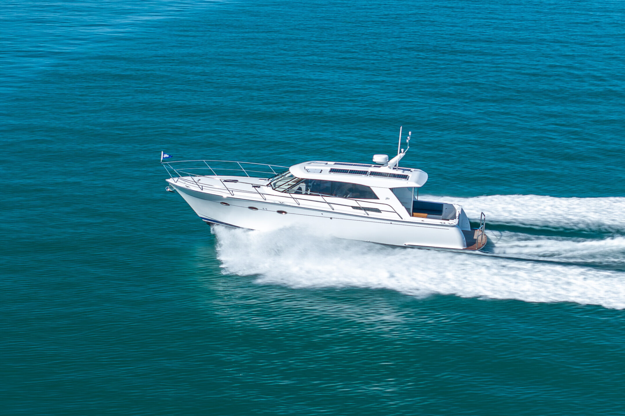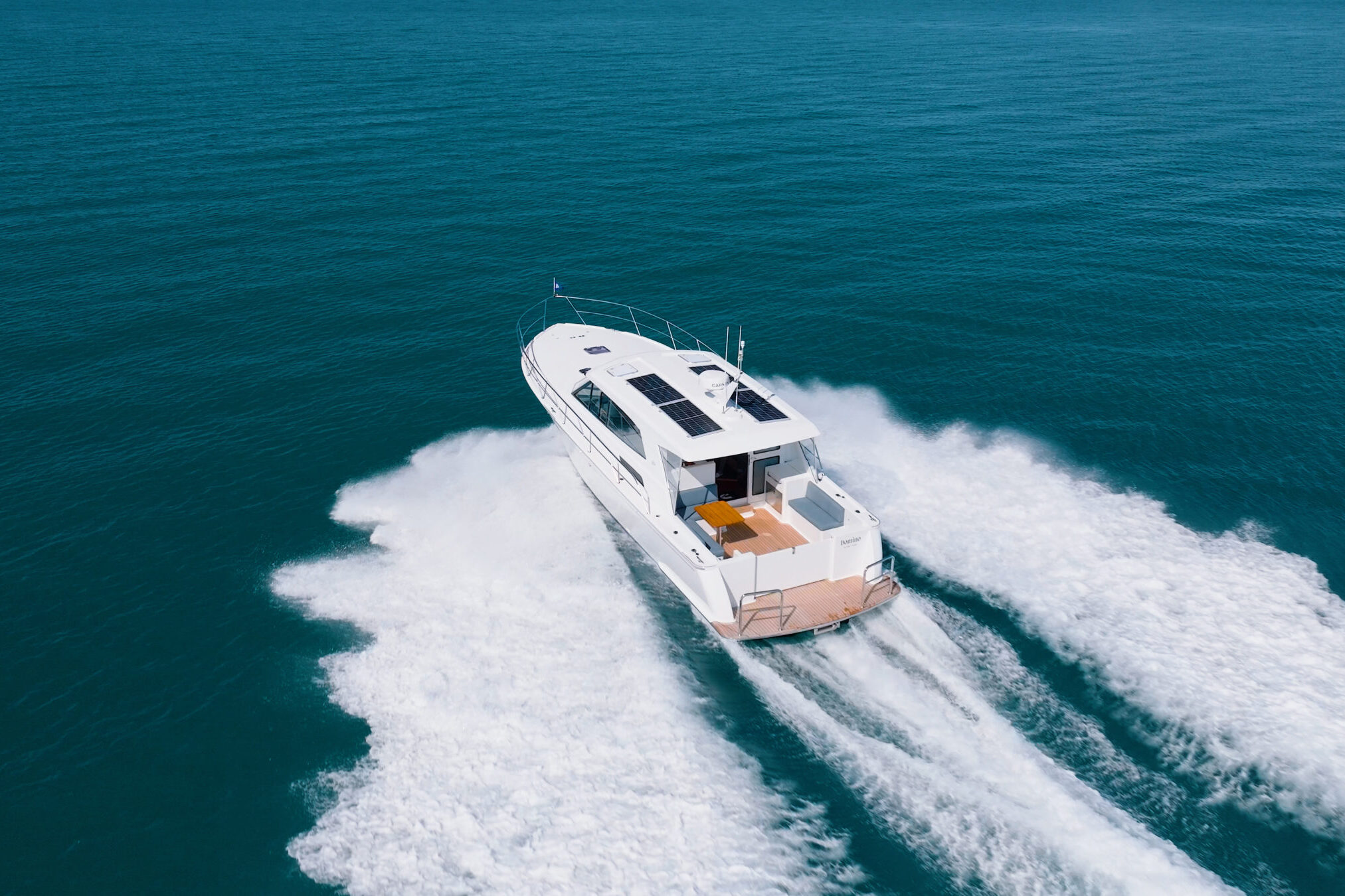 A concealed anchoring system keeps her lines clean, and thoughtful design continues throughout—with bow thruster, ergonomic helm, and a spacious cockpit for dining and entertaining.