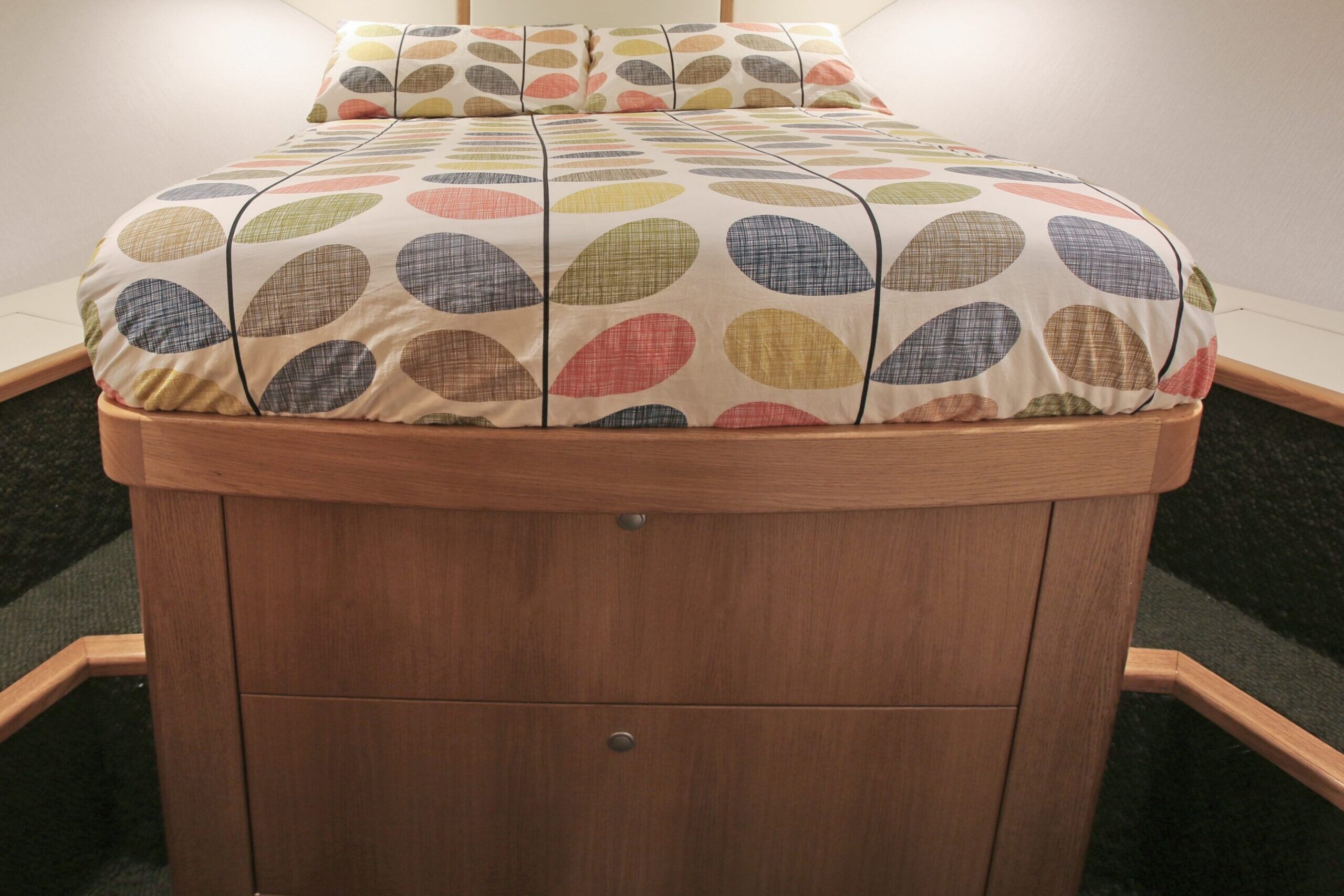 The saloon flows seamlessly into the cockpit, creating a social, open living area connected to the sea. Warm oak joinery, forest green leather, and vintage automotive touches give the interior unique character, while a full galley and solar-supported lithium system provide all the comforts for extended cruising.