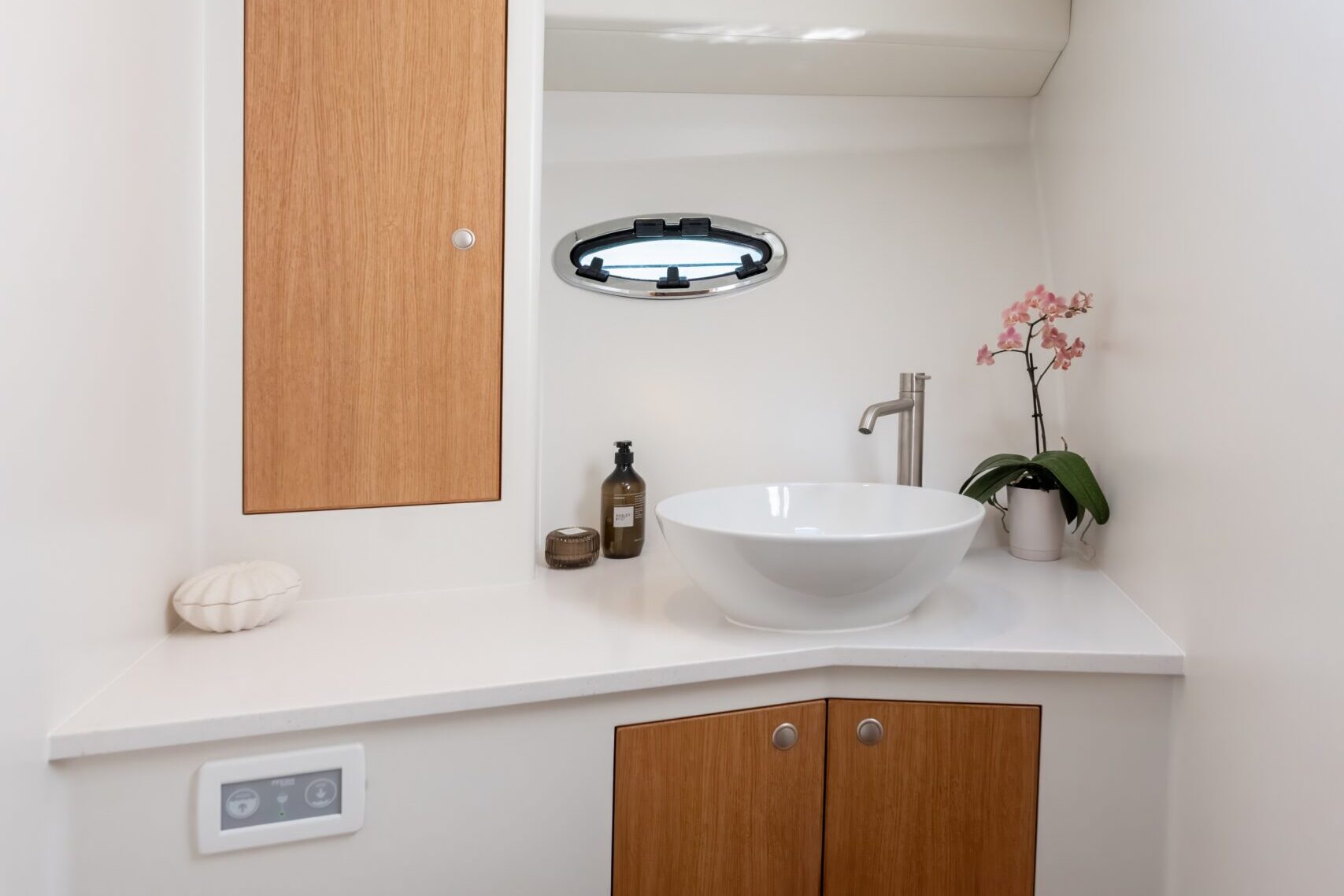 The 13.6m Elite, Domino, is a true expression of the Elite brand—crafted with precision, individuality, and a focus on timeless coastal cruising. Domino offers an exceptional three-stateroom layout—rare for a vessel of this size. The master cabin features a queen island berth, with two guest cabins and separate head and shower smartly arranged for comfort and space.