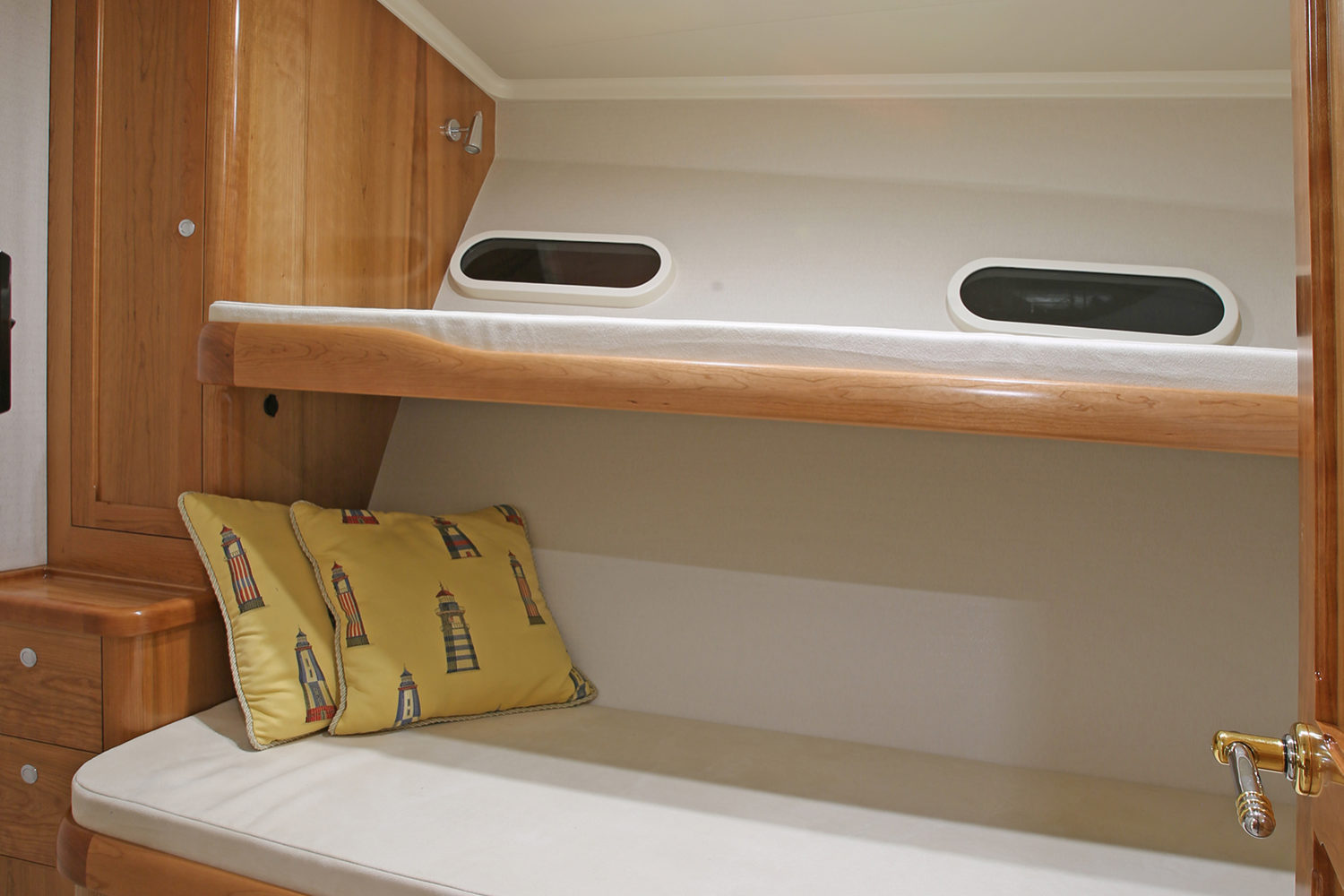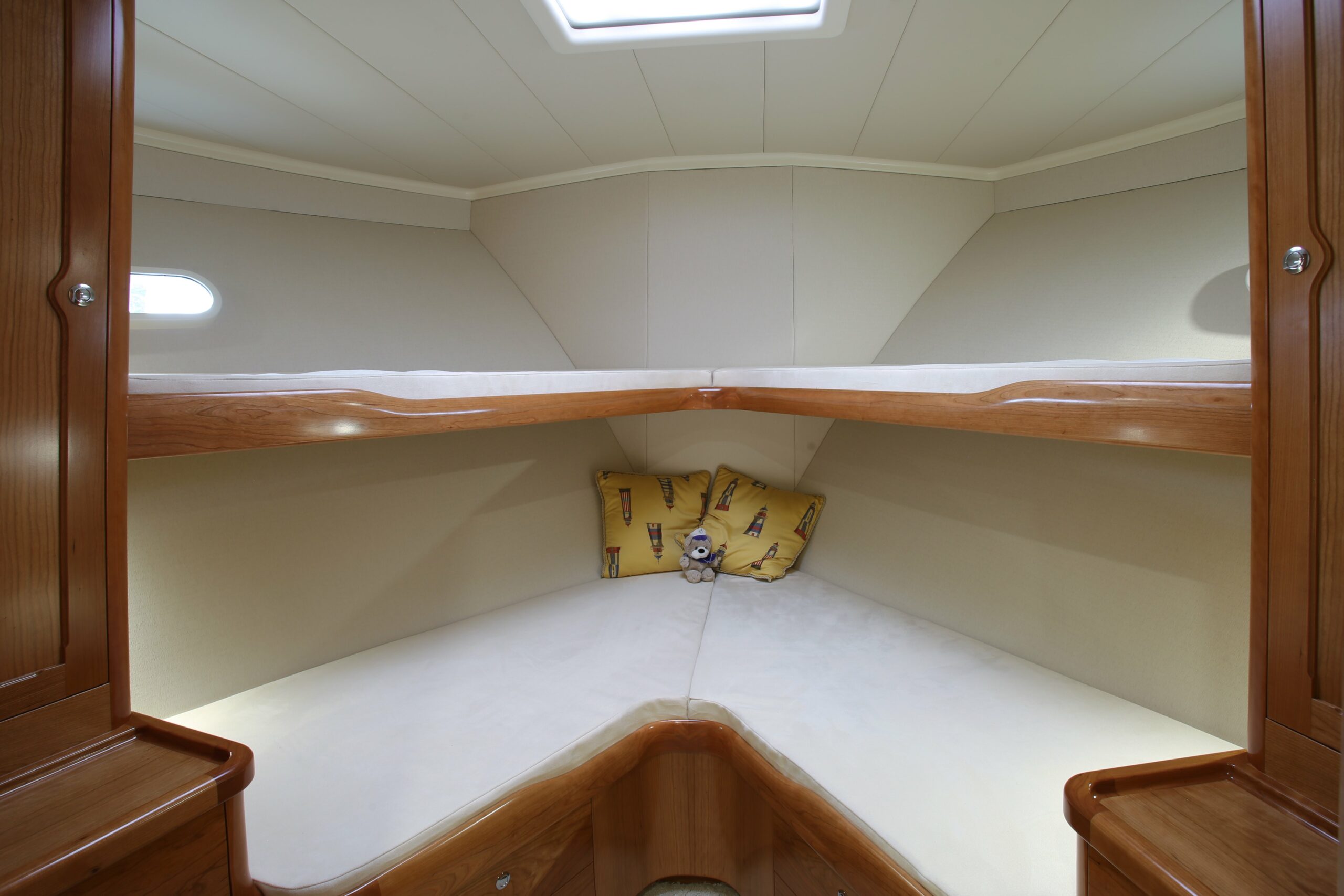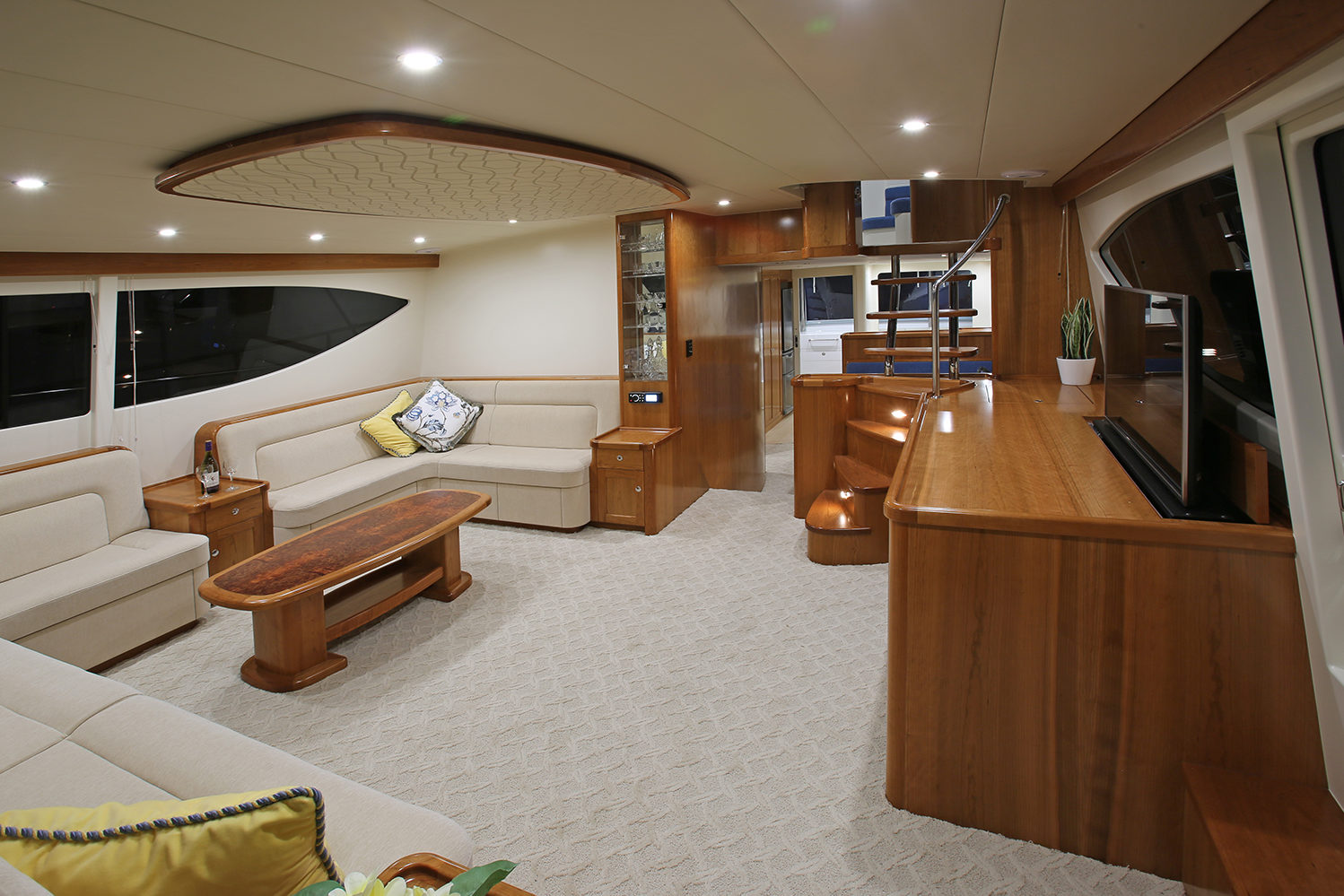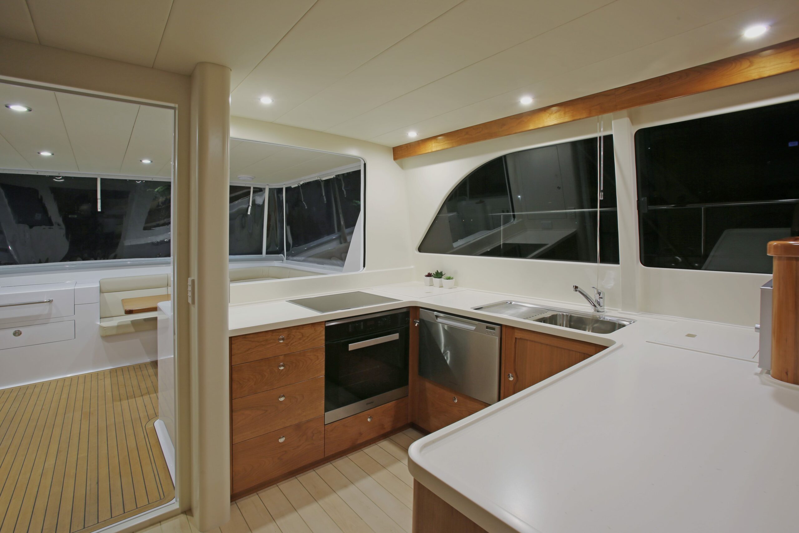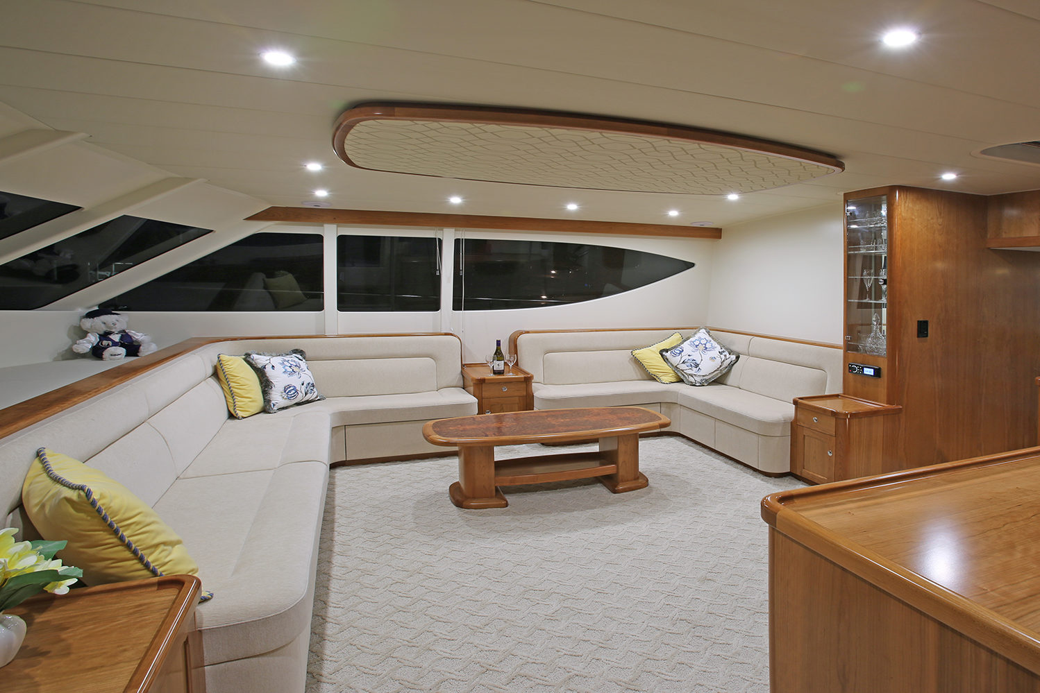 Step into an ambiance of luxury and warmth with Highlander’s cherry wood interior. The heart lies in its cleverly located gourmet galley, strategically positioned between the alfresco dinette and internal dining areas. Indulge in culinary delights while surrounded by the breathtaking vistas of the open sea.